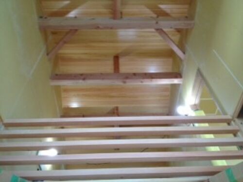 F様邸、なんとか二階に上がれようにしました(^^;; 午後から、I様邸上棟式です。(^-^)/ ozako